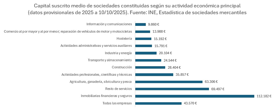 - De acuerdo con los últimos datos publicados por el Instituto Nacional de Estadística (INE), el capital medio suscrito por las sociedades constituidas en lo que llevamos de 2025 es de 43.570 euros, aunque existe mucha variabilidad según el sector de actividad y el tipo societario.