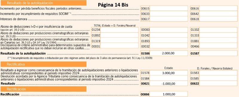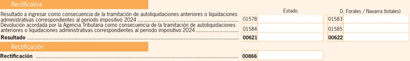 En el caso de haber tributado en la Comunidad Foral de Navarra y/o País Vasco, además se deben incorporar las casillas 1587, 1583, 1585 respectivamente en la casilla 622 tal como en la formula anterior.EJEMPLO. Rectificación para minorar el importe de un ingreso previo realizado.