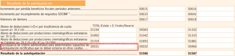 Discrepancia de Criterio Administrativo. Como se ha hecho mención en el apartado anterior, las discrepancias por criterio administrativo son aquellas rectificaciones en las que el contribuyente no está de acuerdo con la interpretación de una norma, no de la norma en sí. La forma de reflejar esto en el Modelo 200 es mediante la casilla 00031, cuyo importe viene dado por la casilla 00032 si tributa exclusivamente en la Administración de Estado. Una vez que tenemos el resultado de la liquidación en la casillas casilla 01586 de forma general se trasladaria directamente a la casilla 00621, pero si existe una autoliquidación rectificativa hay que implementarla al resultado antes de traspasarlo.